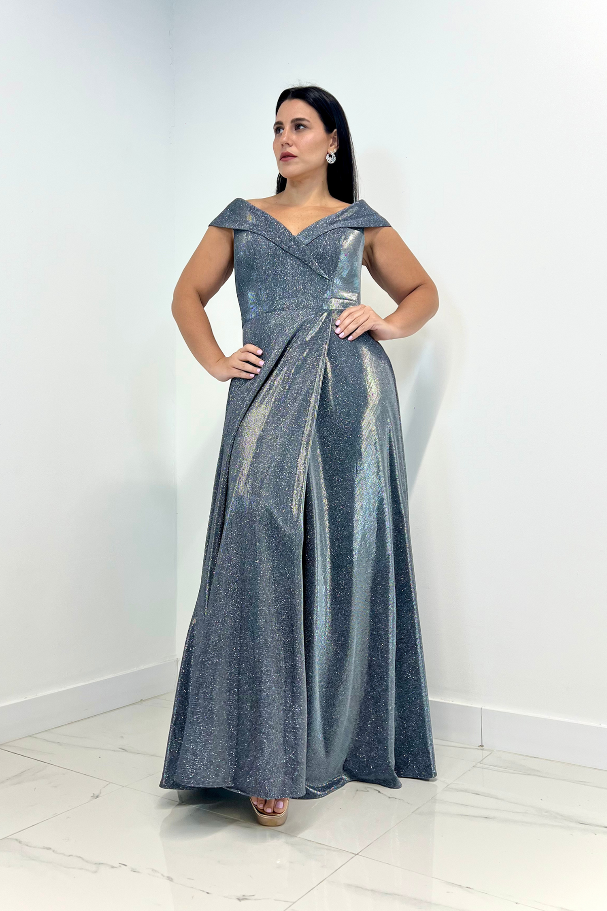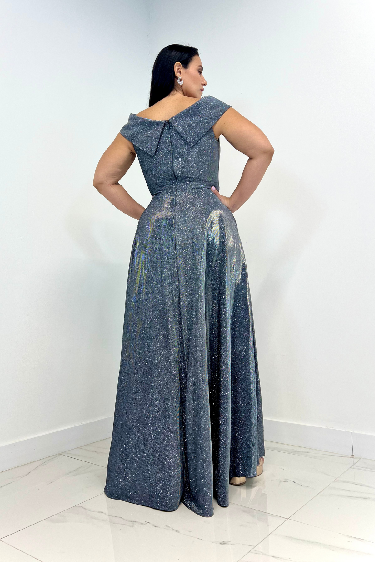 Vestido largo color gris con tela escarchada. Escote corazón y tiene bolsillos
